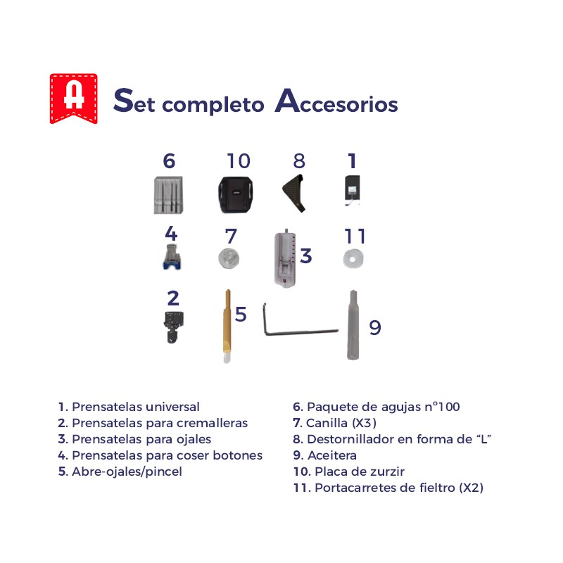 Abre-ojales / pincel, destornillador en forma de "L", Guía para bordes y acolchados, paquete de agujas, canillas, aceitera, placa de zurcir, porta carretes de fieltro y funda protectora para el polvo.