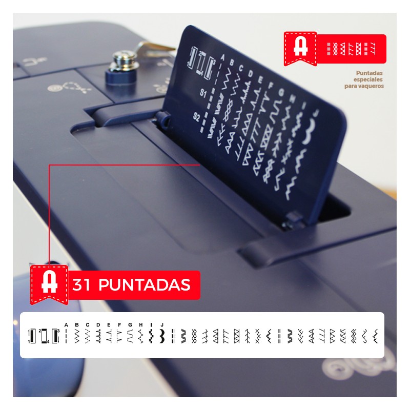 Dispone de 31 puntadas, motor DC, con puntadas dedicadas a vaqueros y ajuste del ancho y largo de puntada. Todo lo que necesitas para iniciar cualquier proyecto de costura y conseguir acabados perfecto.