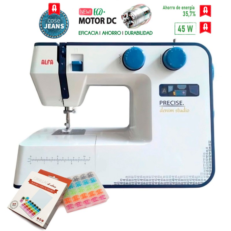 Si buscas una máquina que te brinde potencia, precisión y versatilidad, la Alfa Precise Denim Studio es la opción ideal. Es una maquina domestica que puede trabajar con telas gruesas como vaqueros y cuero, esta máquina garantiza resultados profesionales sin complicaciones. Su motor ECO DC de 45W proporciona una gran fuerza de penetración en los tejidos, permitiendo coser varias capas sin esfuerzo y con un consumo de energía reducido.